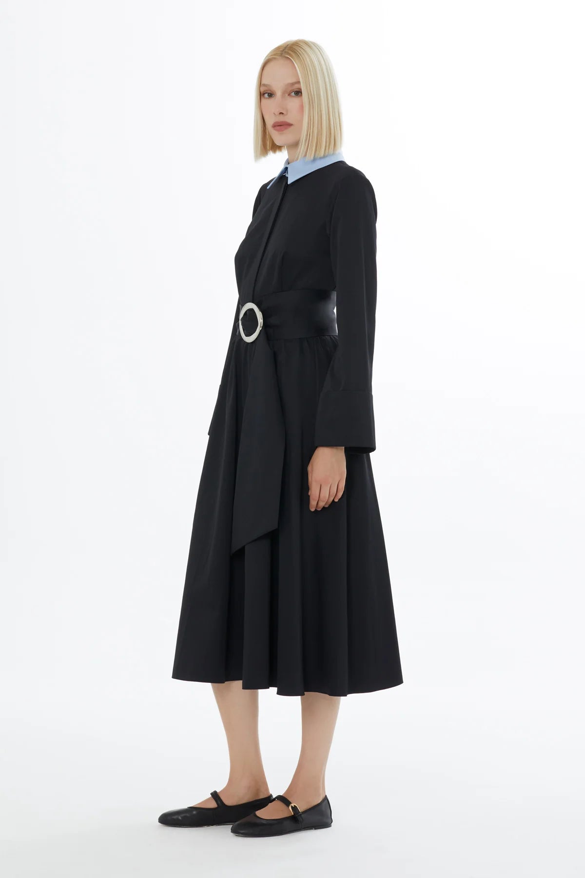 Uzun Kollu Kuşaklı Garni Yakalı Midi Elbise