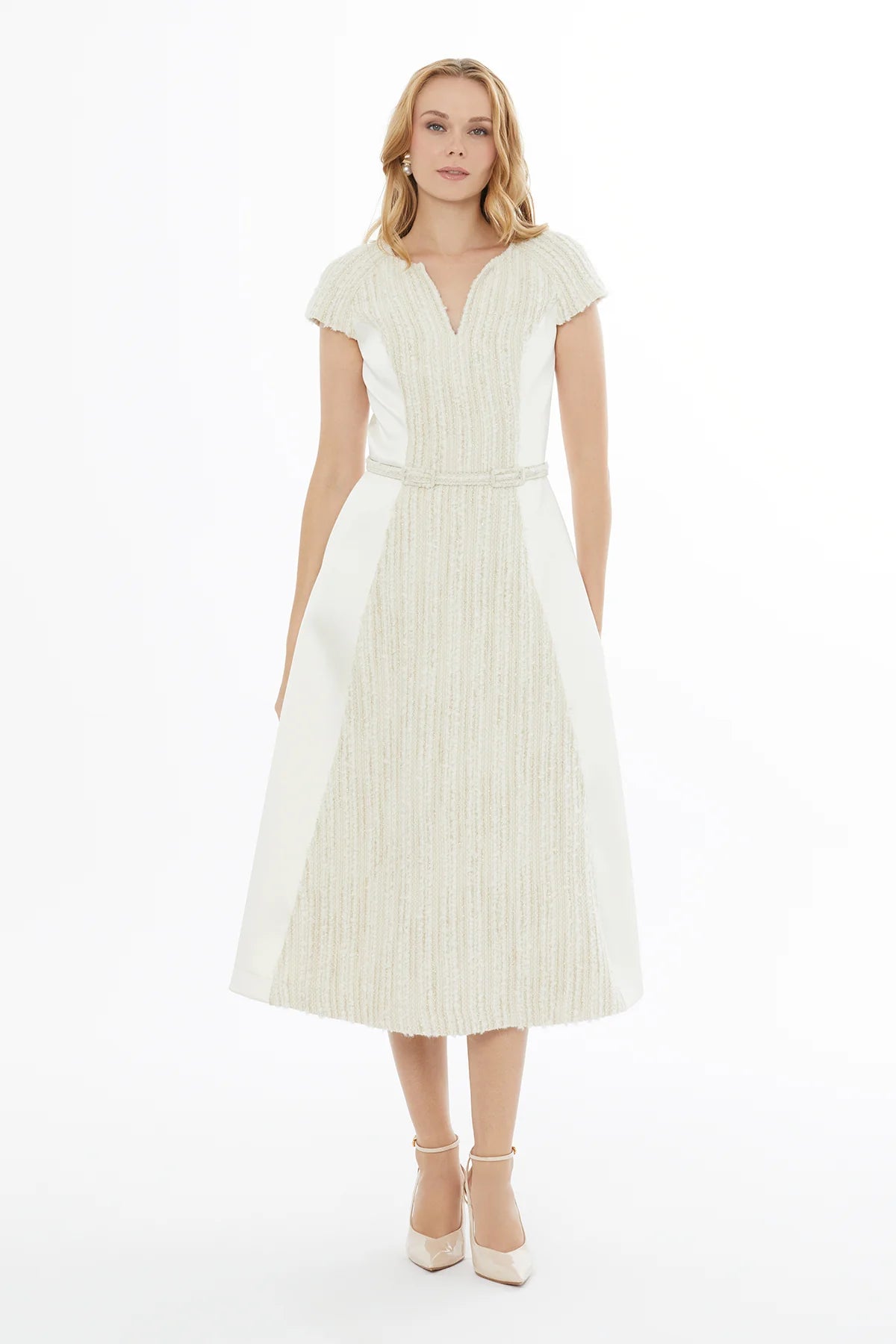 V Yaka Fermuar Kapamalı Kısa Kol Midi Elbise