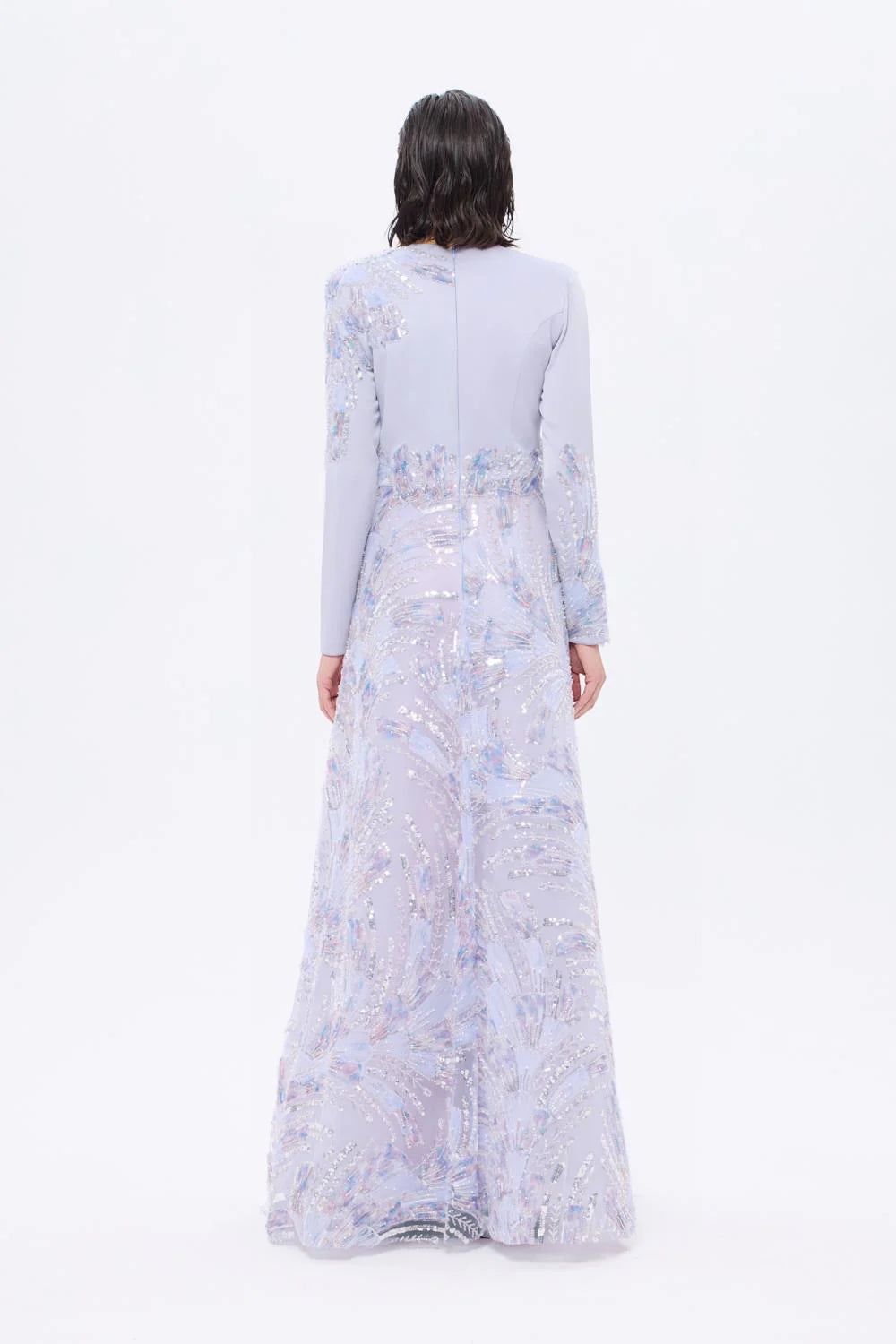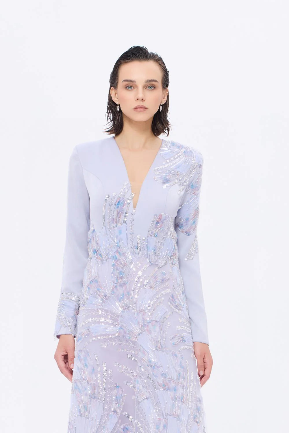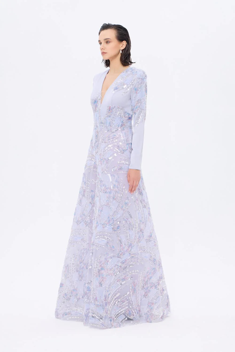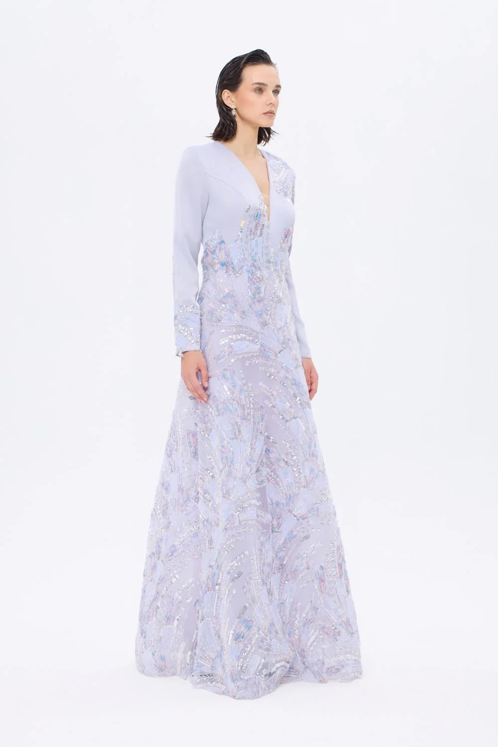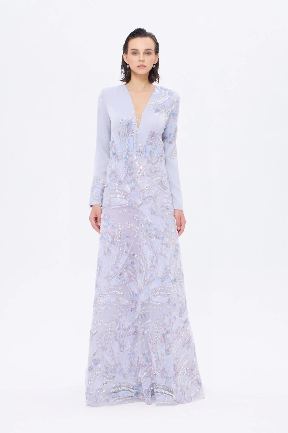 V YAKA İŞLEME DETAYLI UZUN KOLLU UZUN ABİYE ELBİSE - AP0023