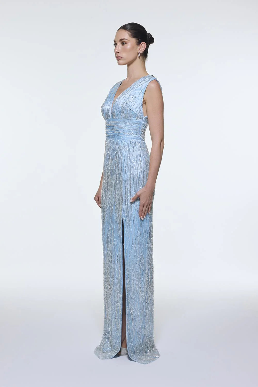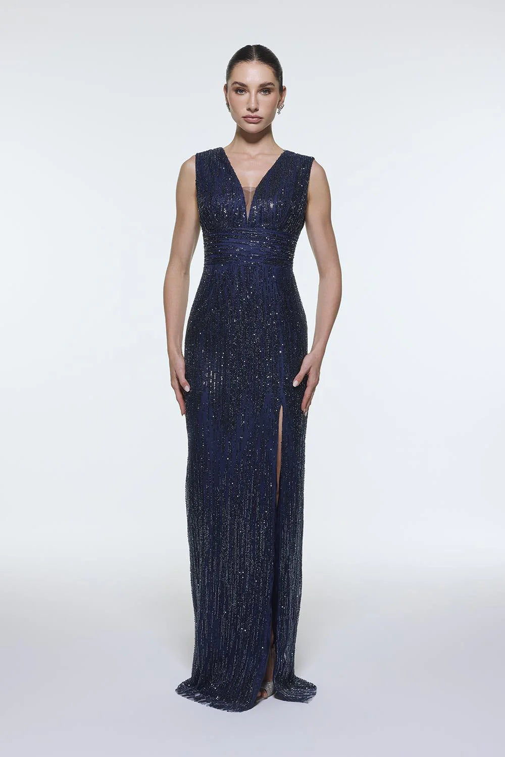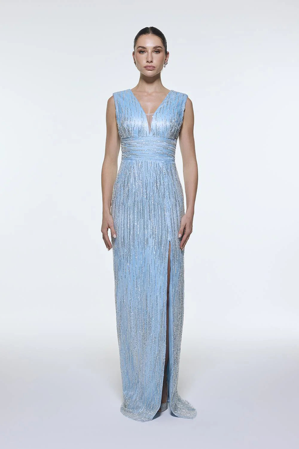 V YAKALI KOLSUZ TAŞ İŞLEMELİ ABİYE ELBİSE - 9349C