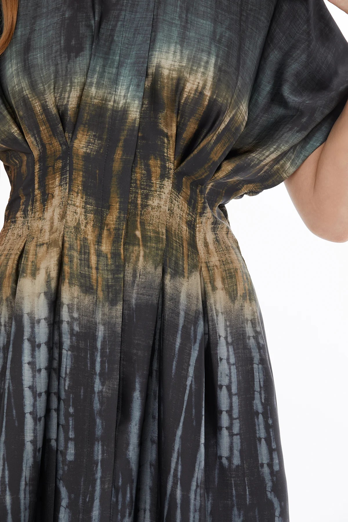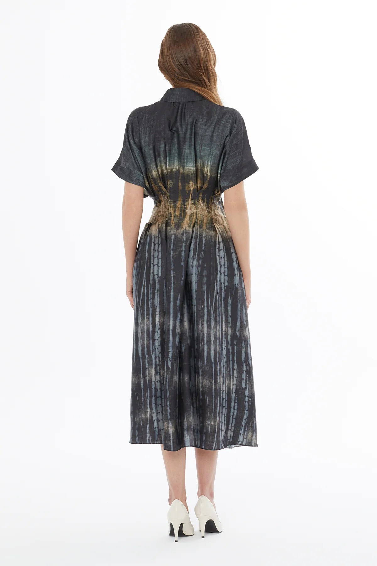 Yakalı Önden Düğmeli Desenli Midi Elbise