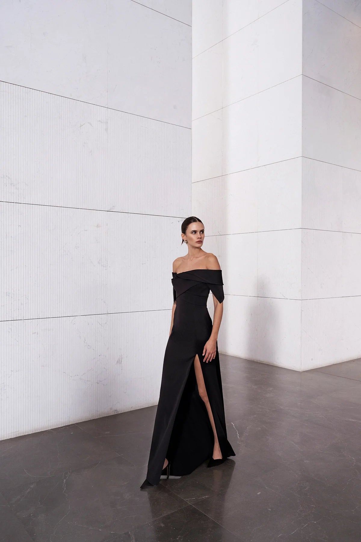 DRAPELİ OMUZLARI AÇIK YIRTMAÇ DETAYLI UZUN ABİYE ELBİSE