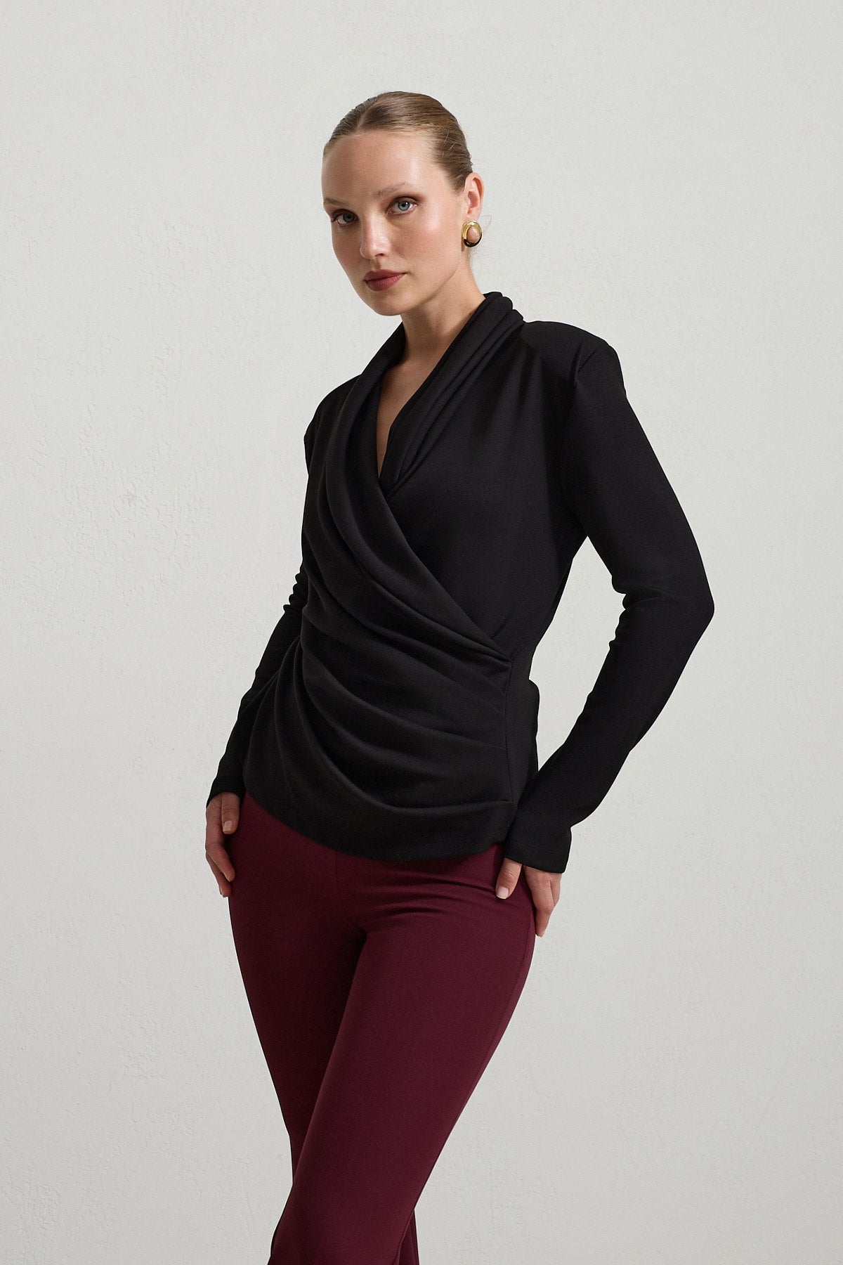 Siyah Drapeli Uzun Kollu V Yaka Bluz