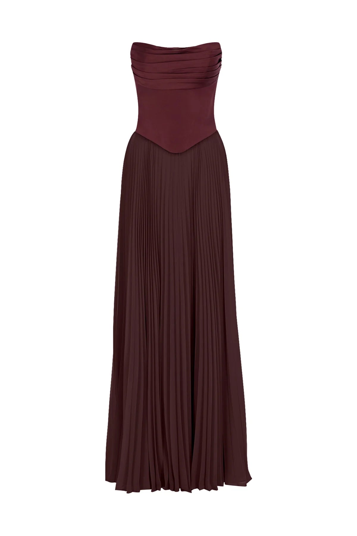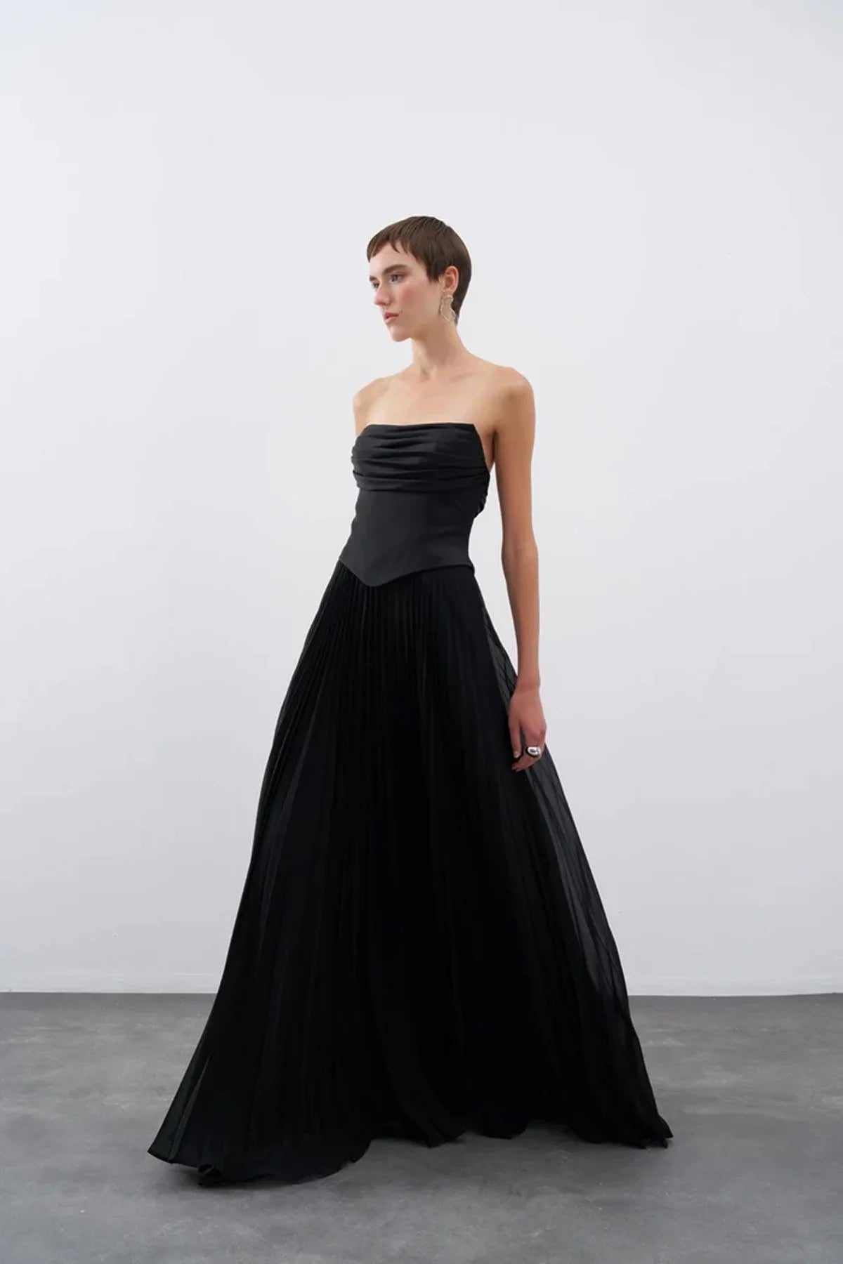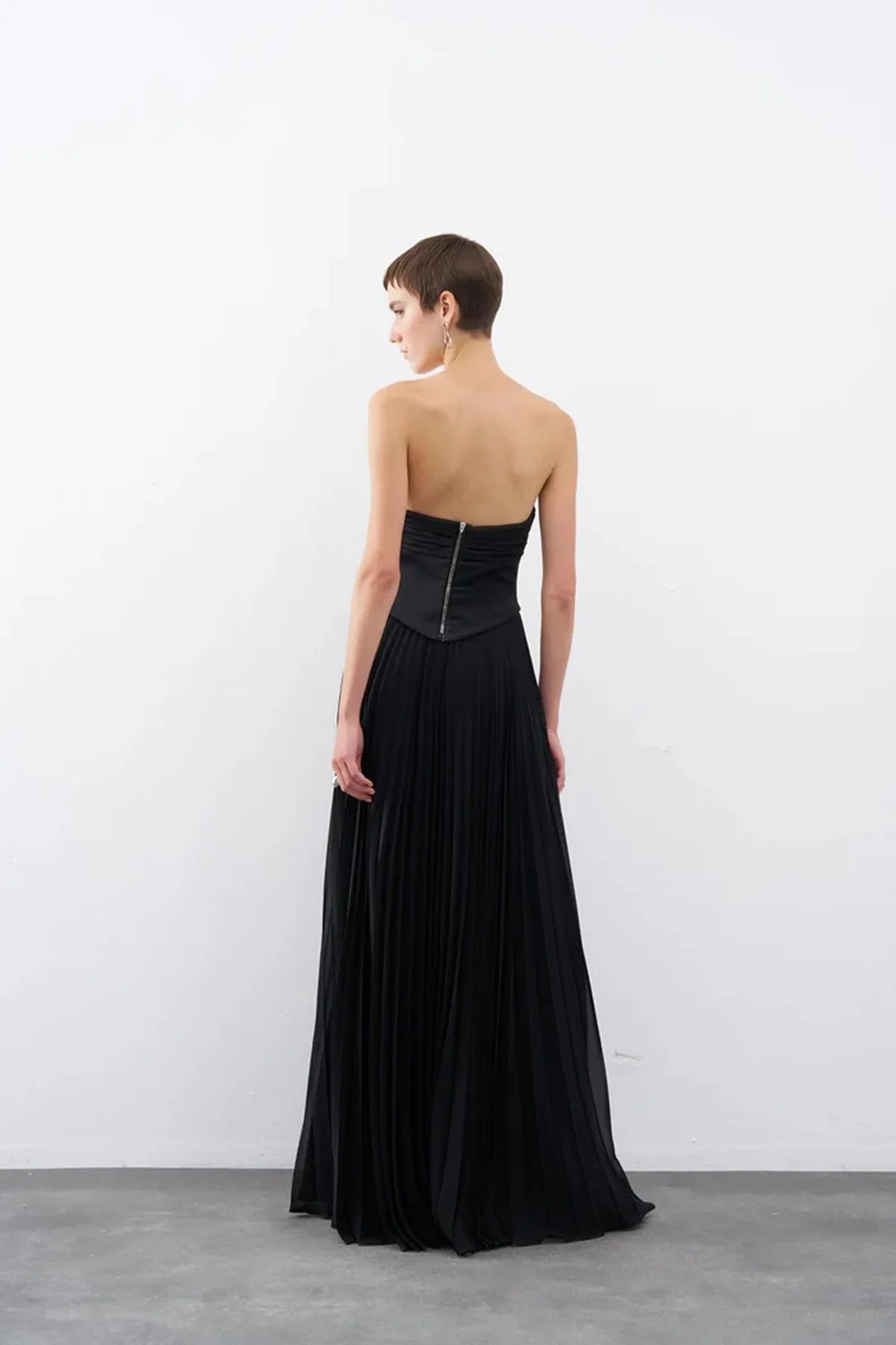 STRAPLEZ DRAPELİ ETEĞİ PİLİSELİ UZUN ABİYE ELBİSE