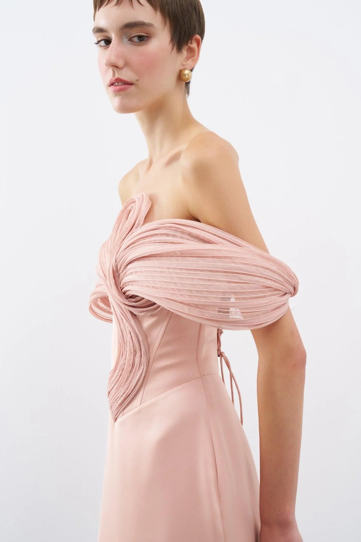 STRAPLEZ DÜŞÜK OMUZLU ORGANZE DETAYLI UZUN ABİYE ELBİSE