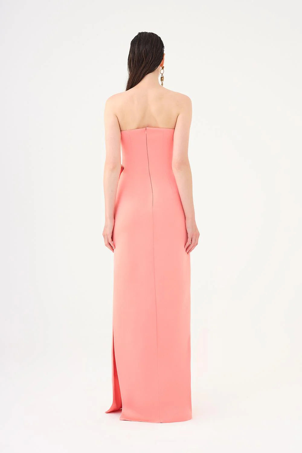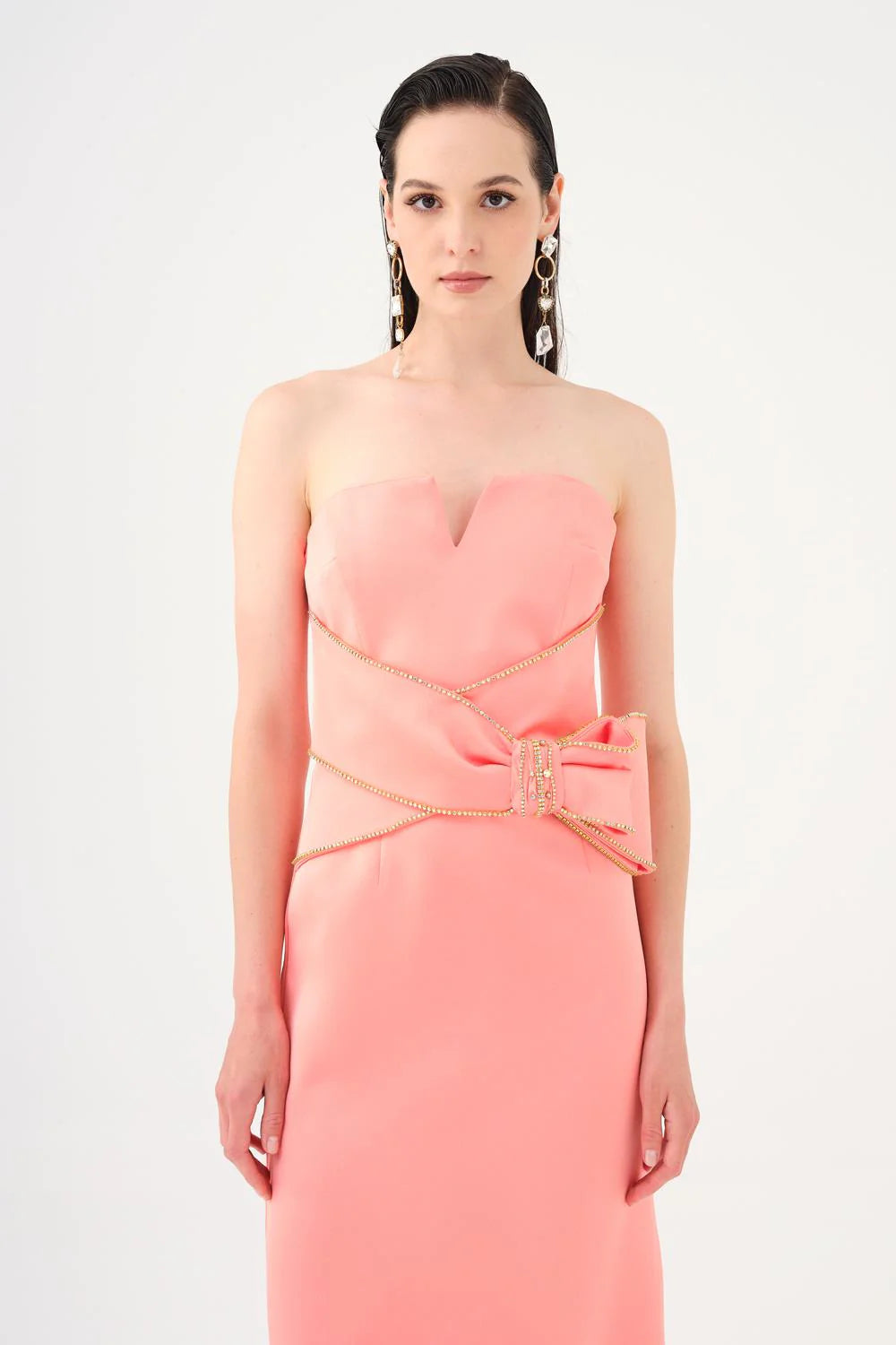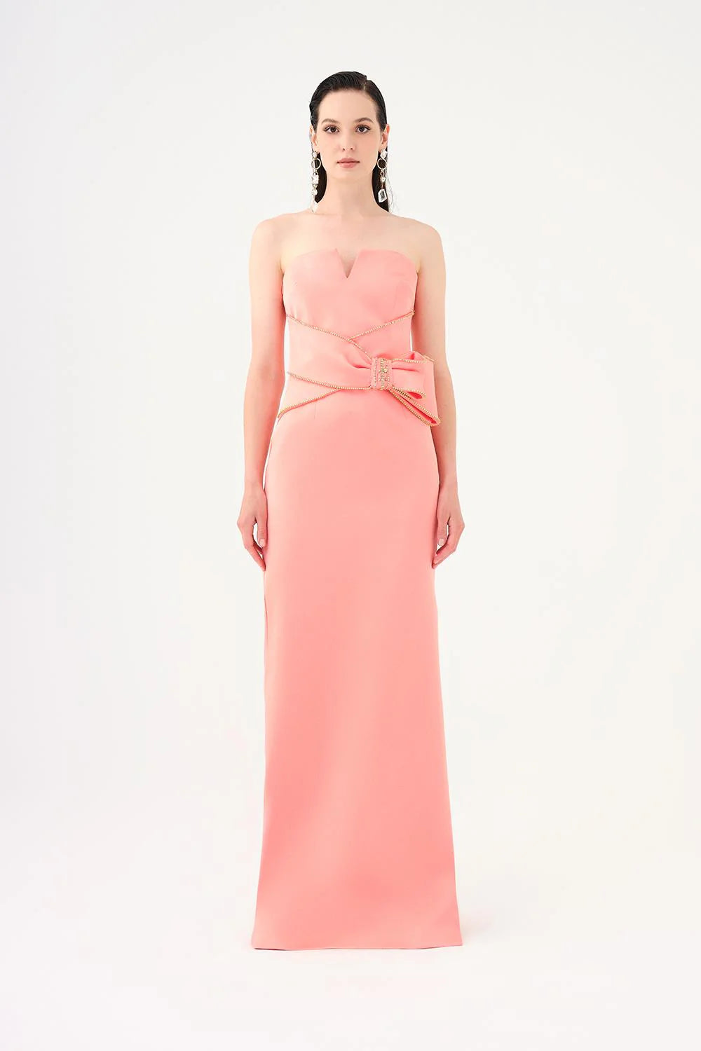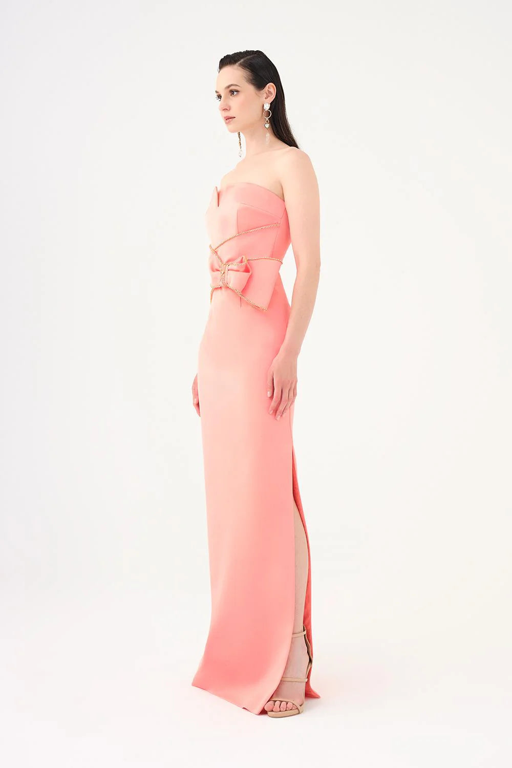 TAŞ İŞLEME DETAYLI STRAPLEZ YAKA UZUN ABİYE ELBİSE - 9185C