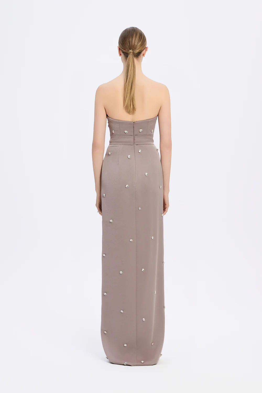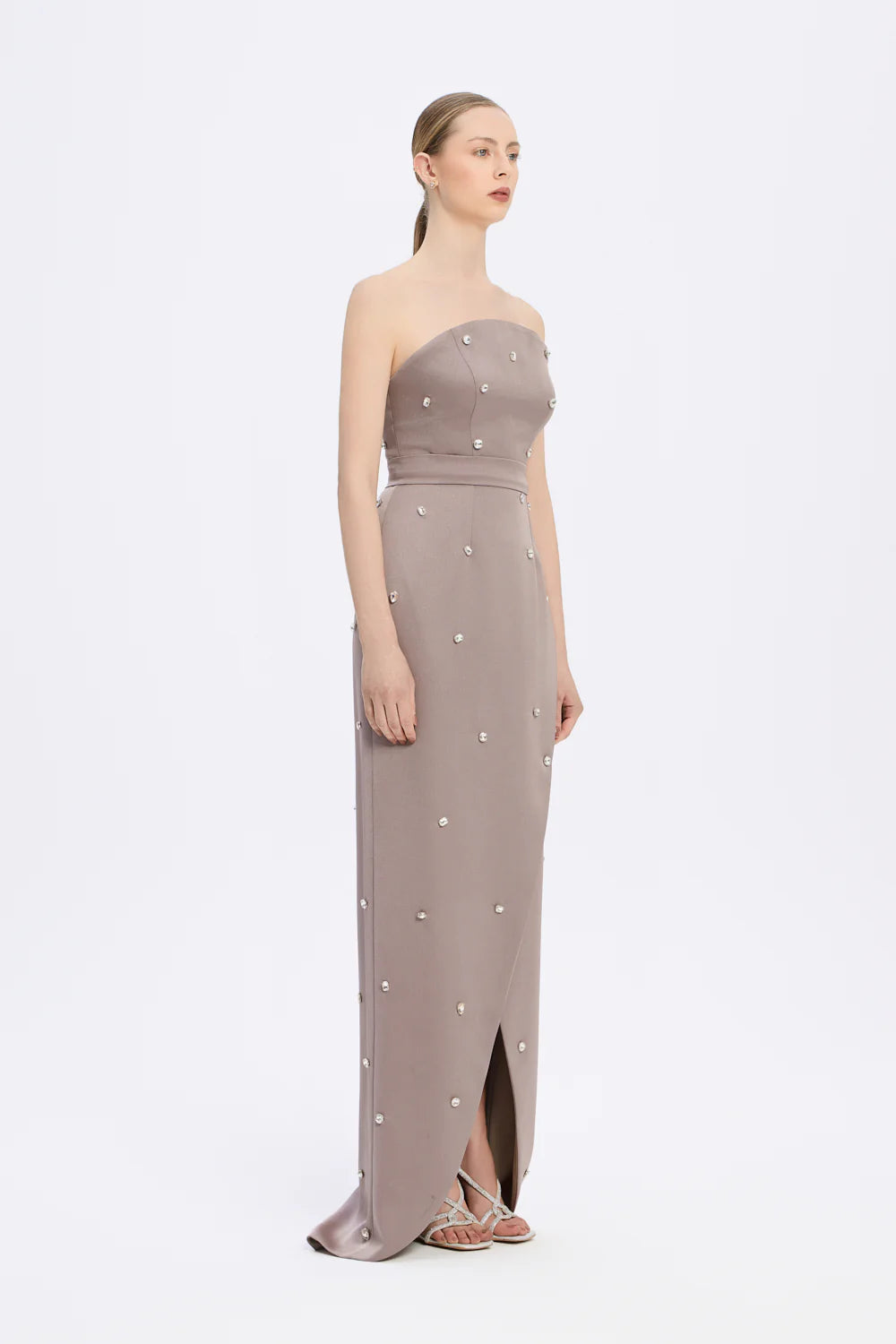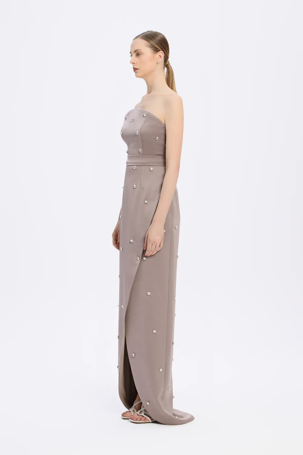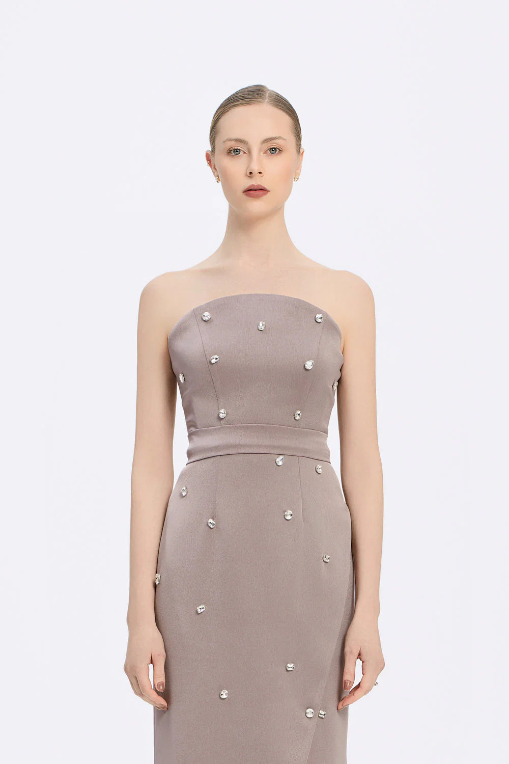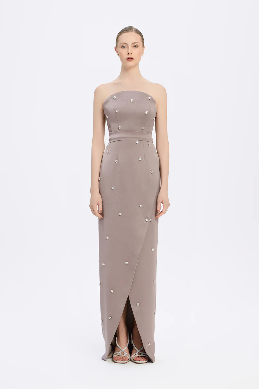 TAŞ İŞLEMELİ DETAYLI STRAPLEZ YIRTMAÇLI UZUN ABİYE ELBİSE - 2002C