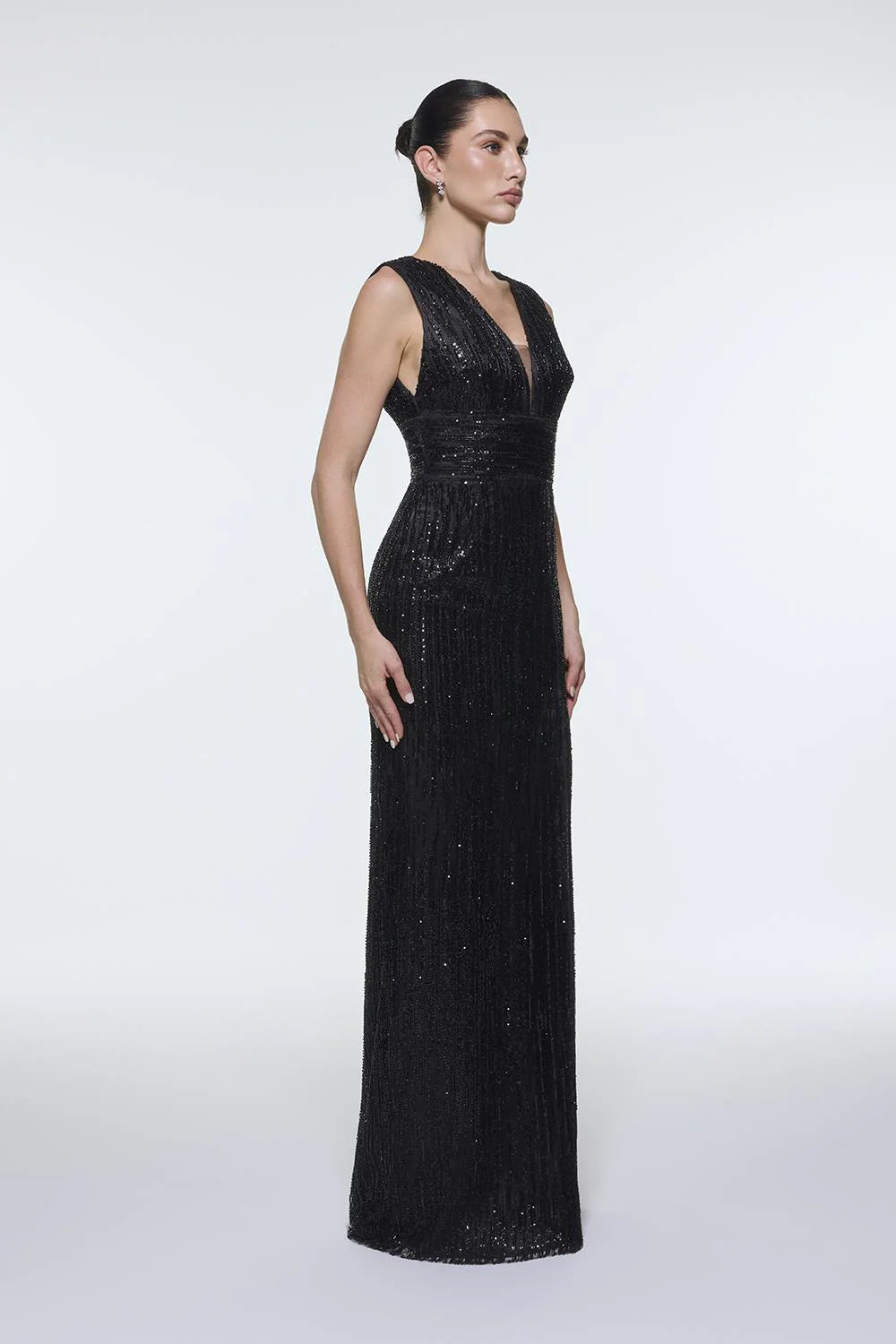 V YAKALI KOLSUZ TAŞ İŞLEMELİ ABİYE ELBİSE - 9349C