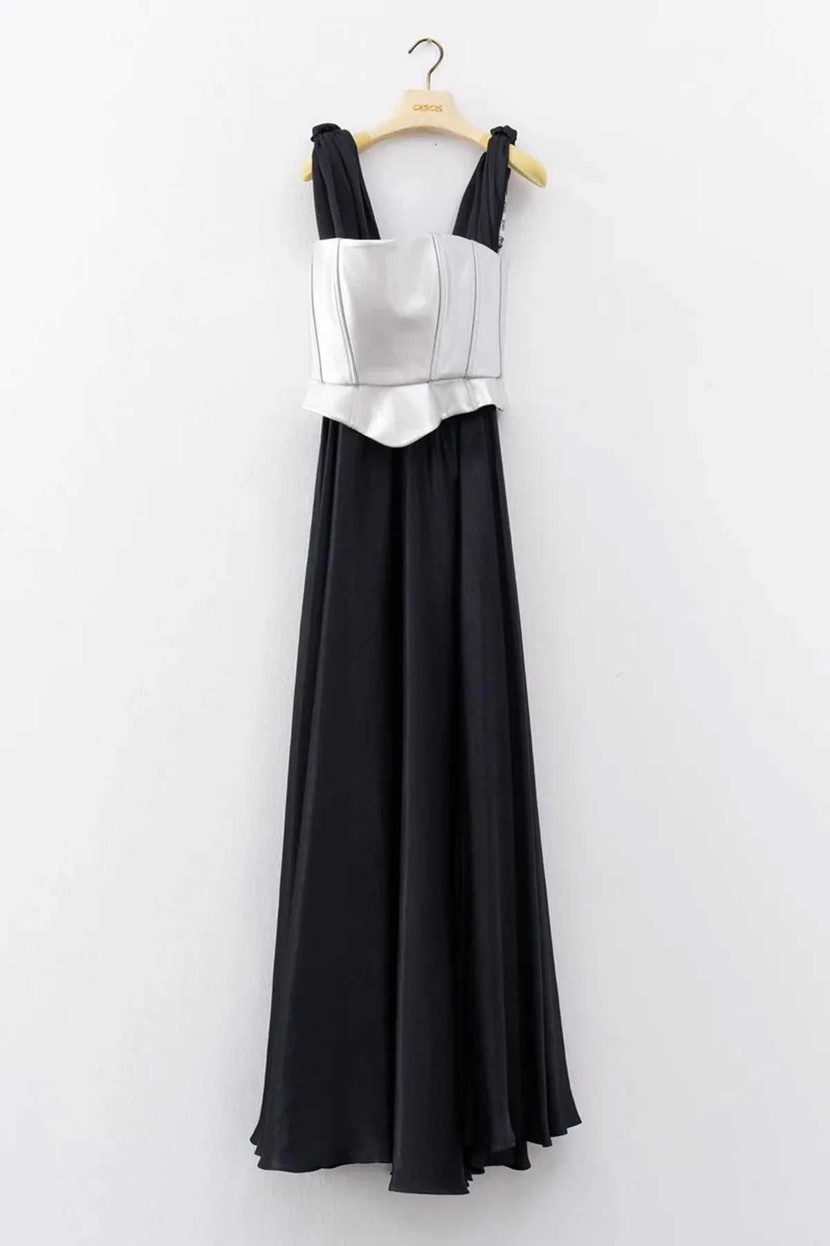 ASKILI METALİK KORSAJLI UZUN ABİYE ELBİSE