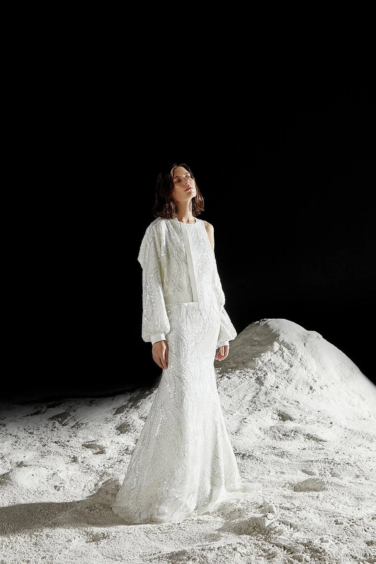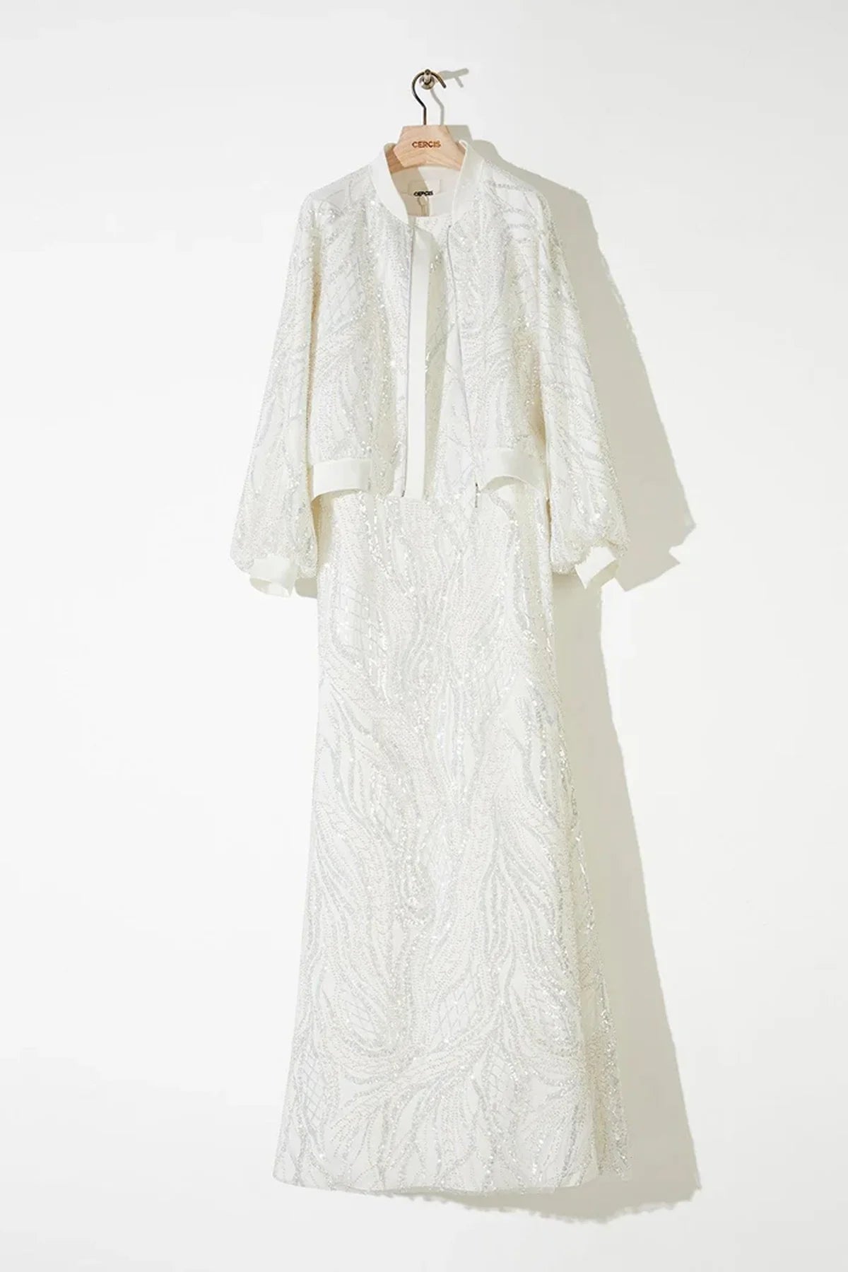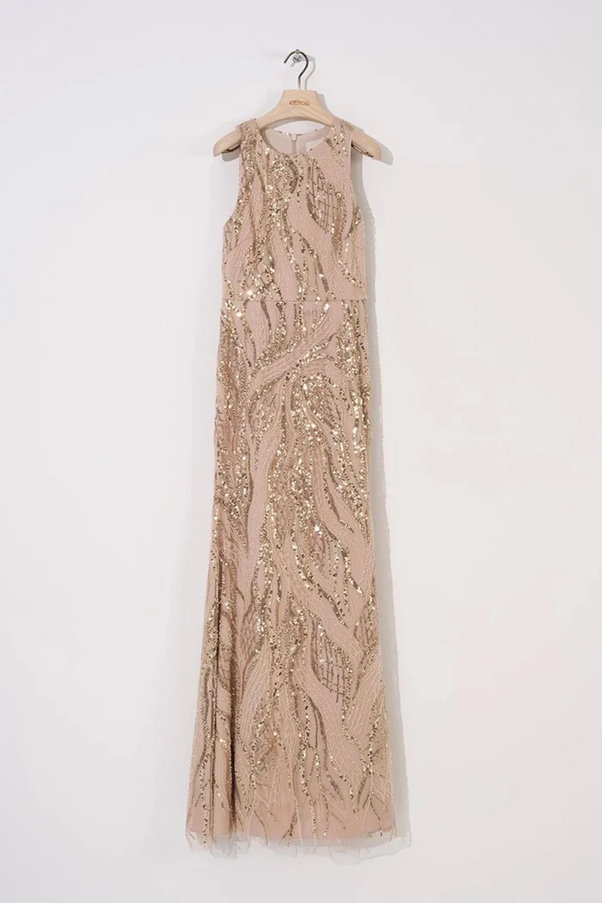- Kumaşı kendinden işlemeli, bisiklet yaka, kolsuz, tül destekli, arka ortası gizli fermuarlı, astarlı uzun abiye elbise.