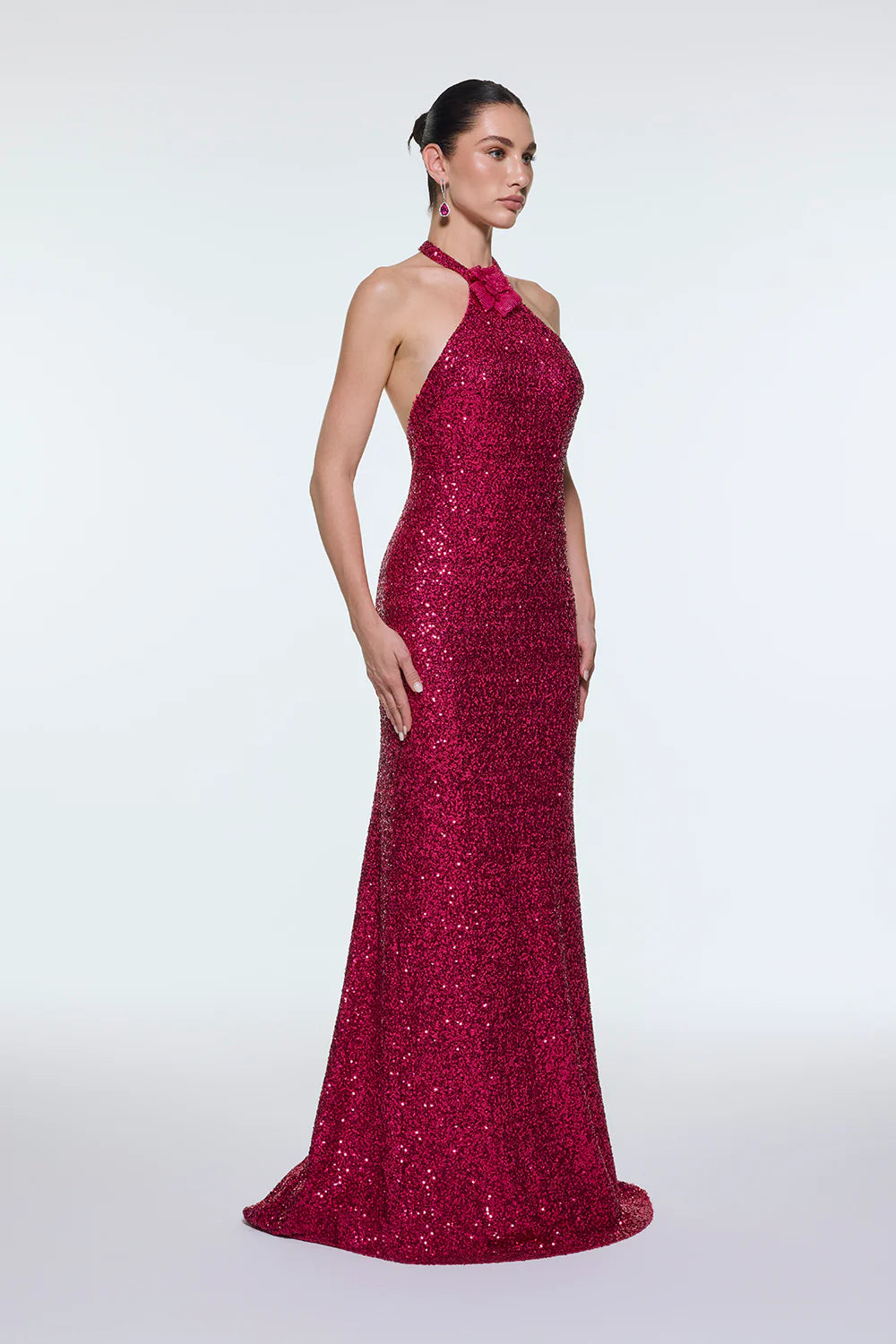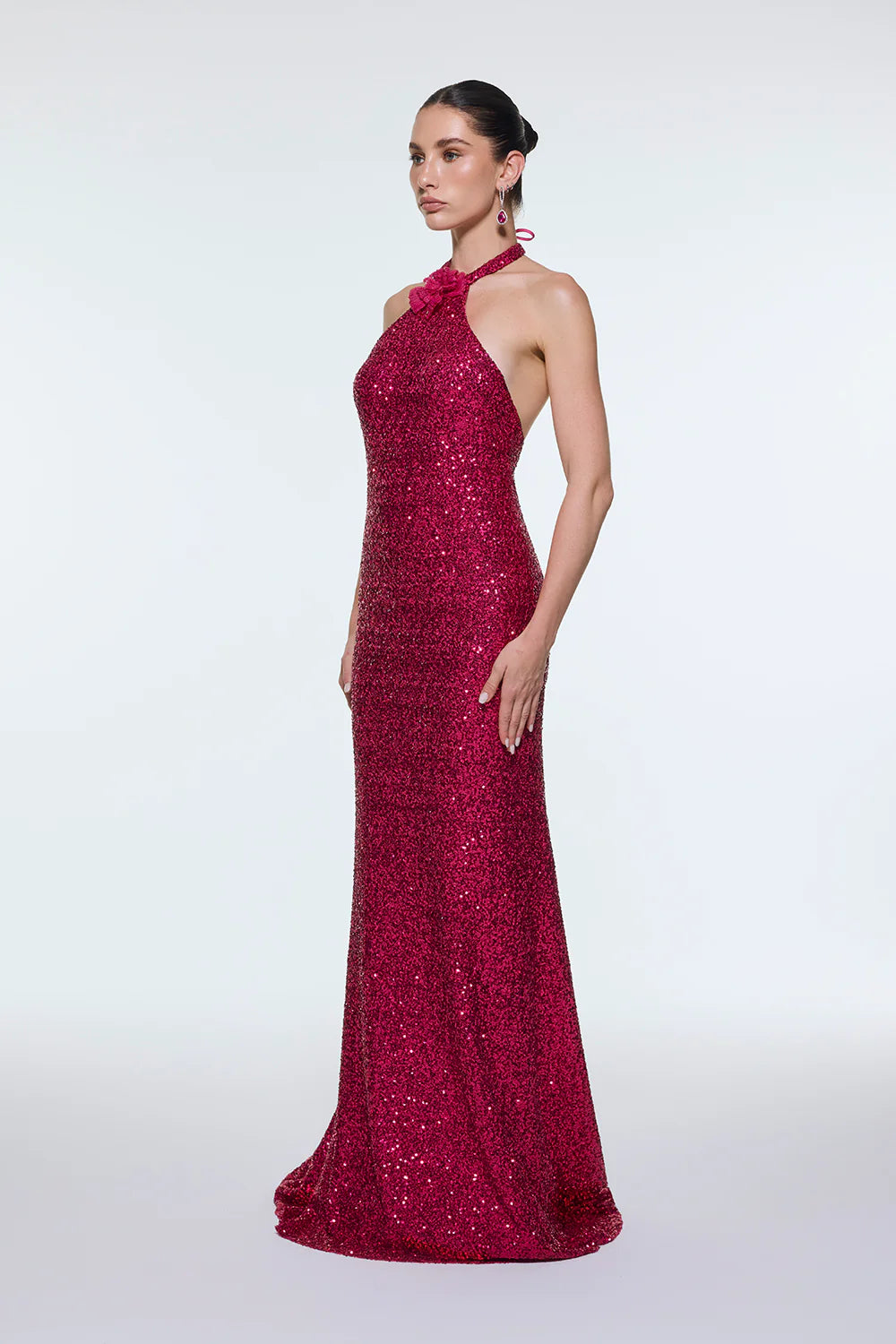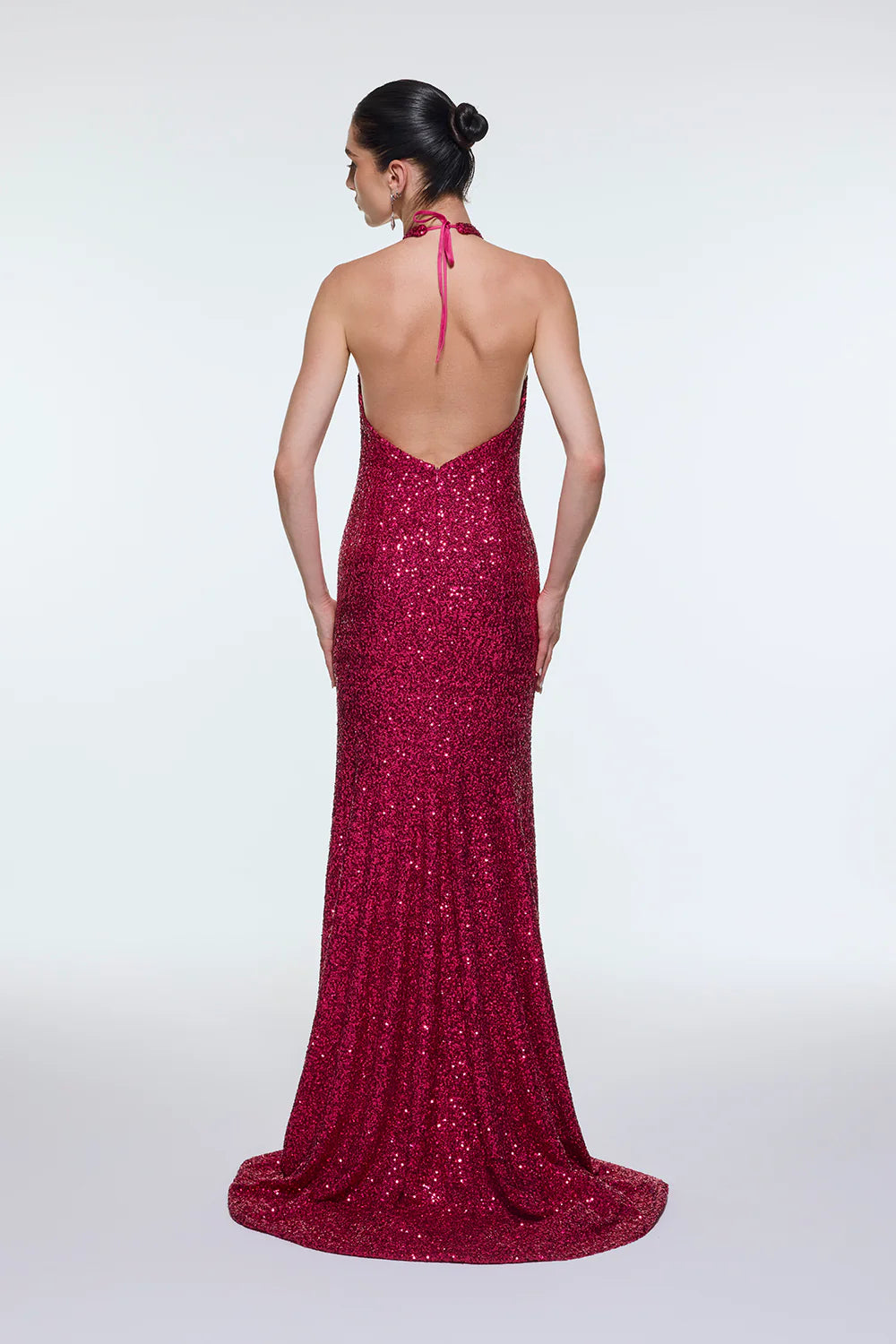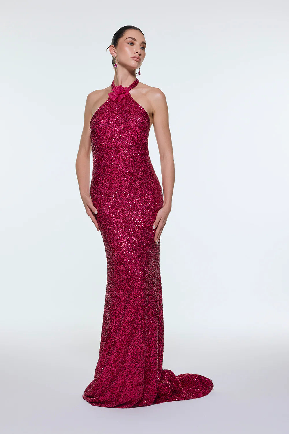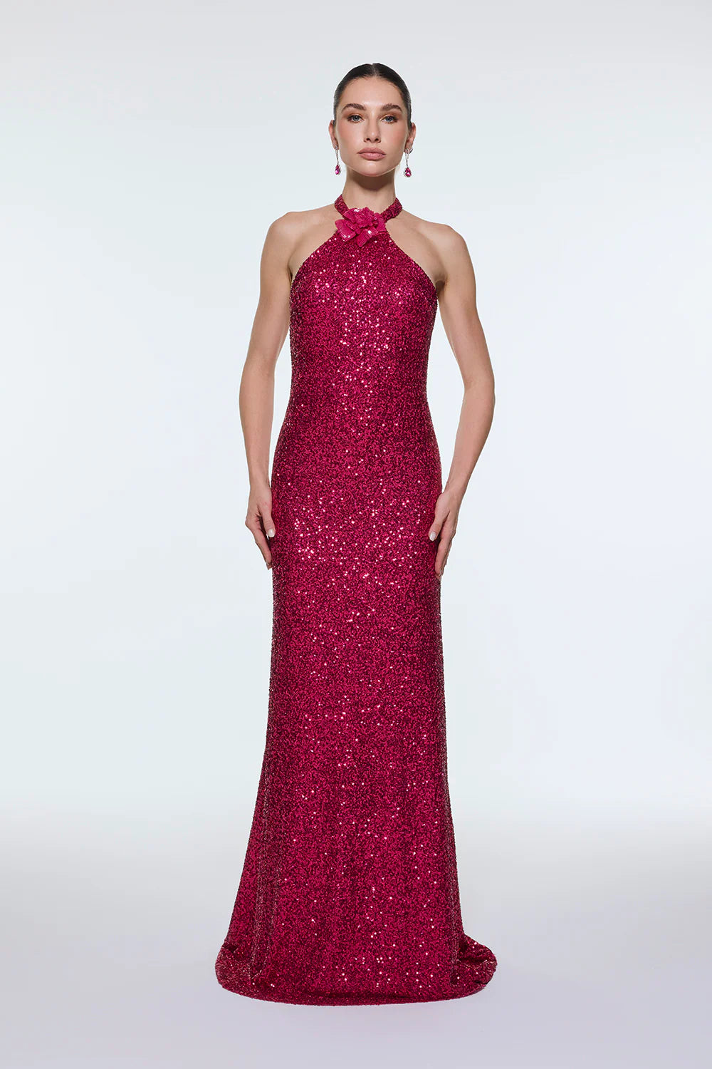 BOYUNDAN ASKILI ÇİÇEK DETAYLI PAYET UZUN ABİYE ELBİSE - 9348C