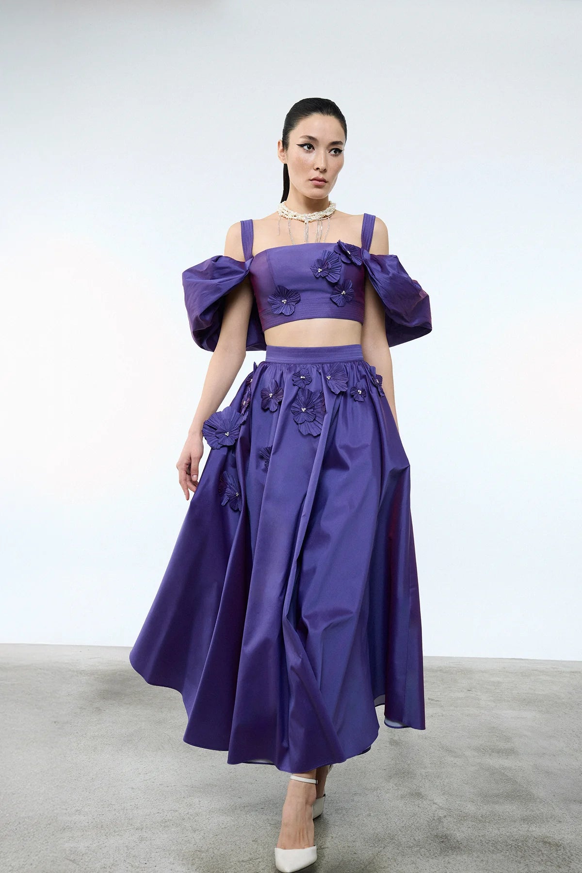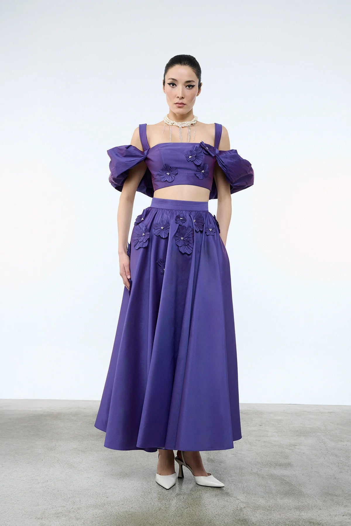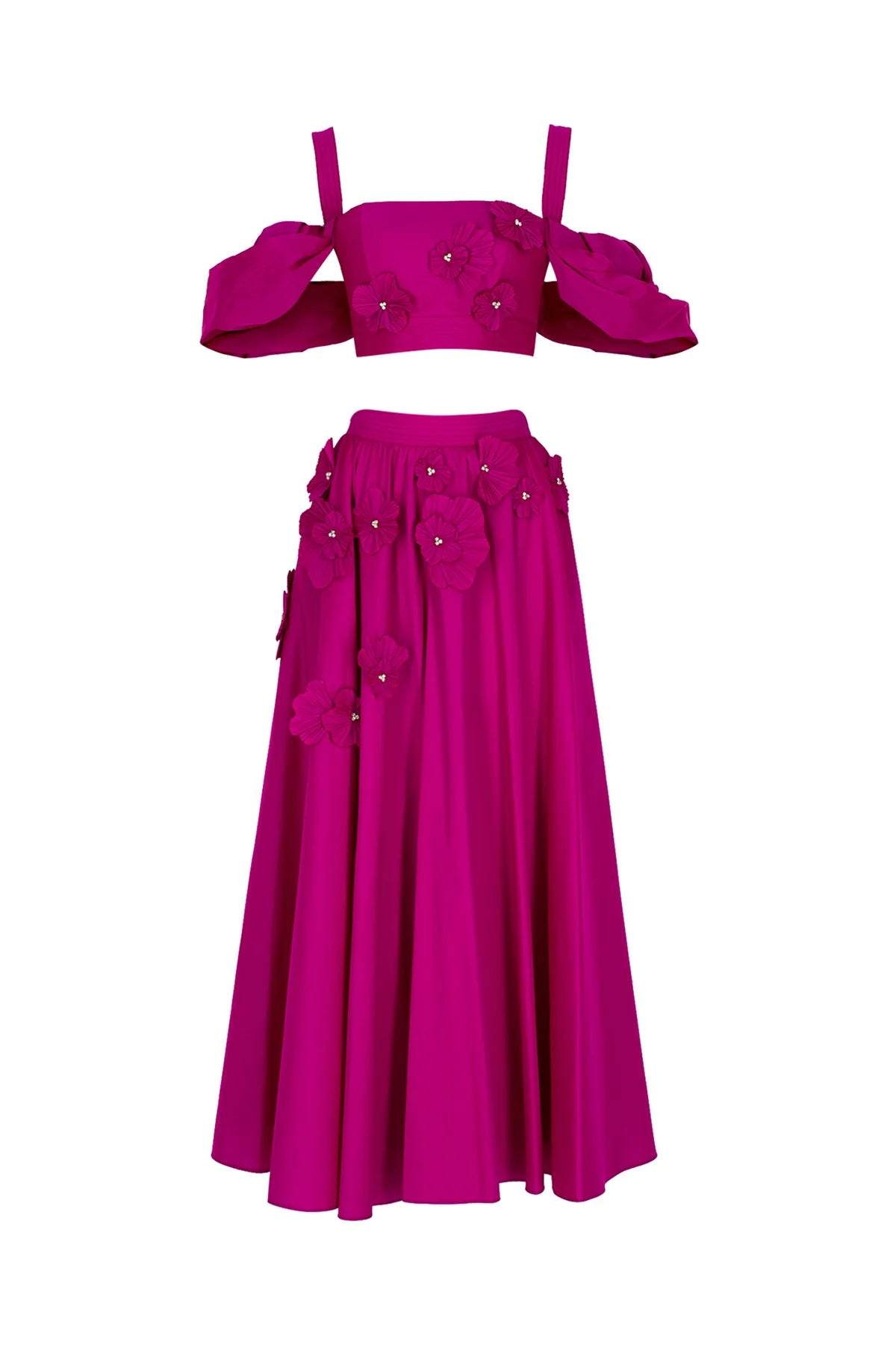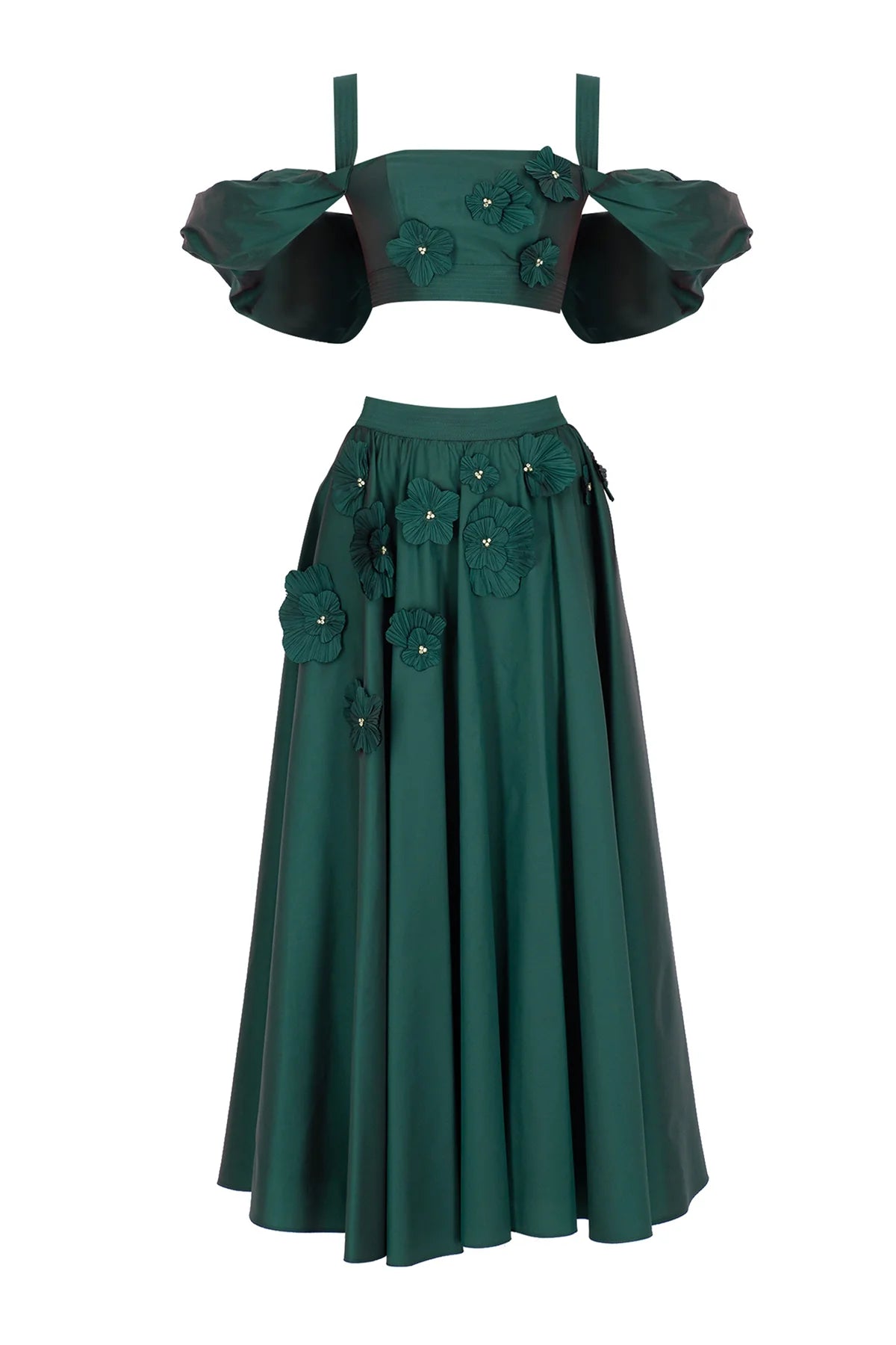 ÇİÇEK APLİKELİ CROP VE KABARIK ETEKLİ ABİYE TAKIM