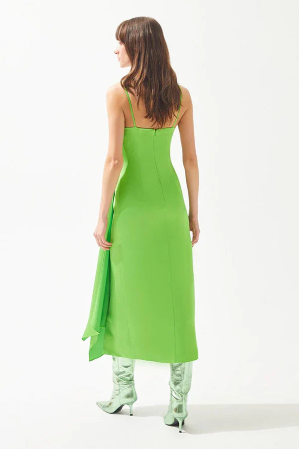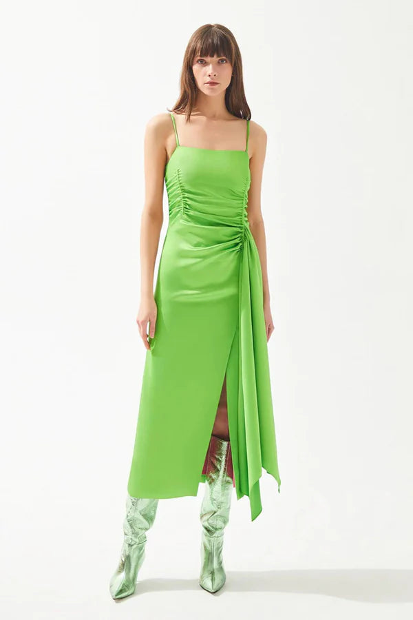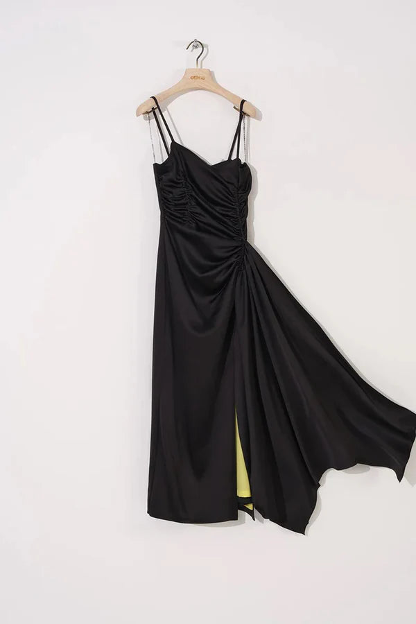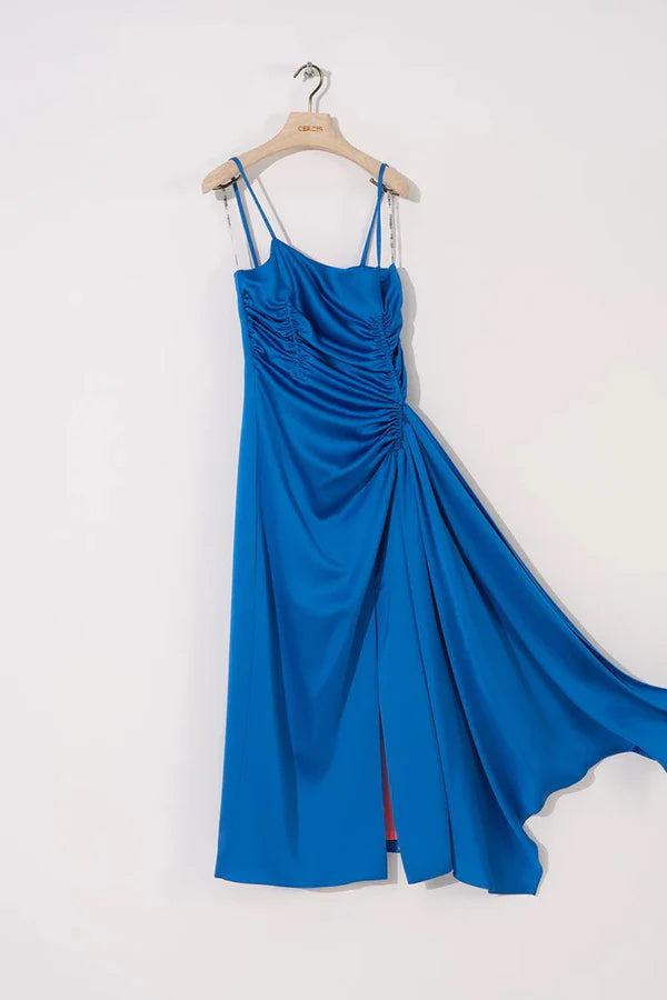 İNCE ASKILI BÜZGÜ DETAYLI YIRTMAÇLI MİDİ BOY ELBİSE