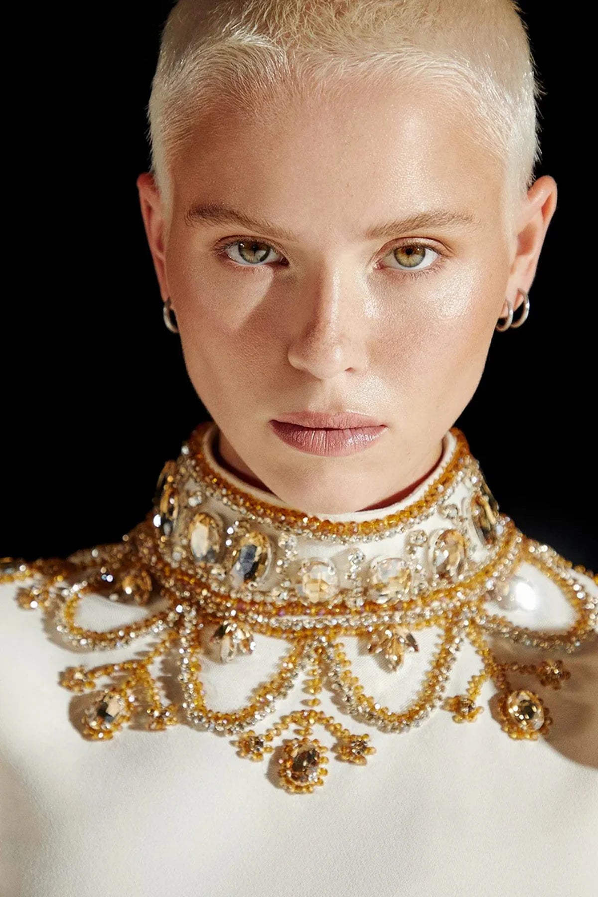 KASNAK İŞLEME MANŞETLİ UZUN ELBİSE