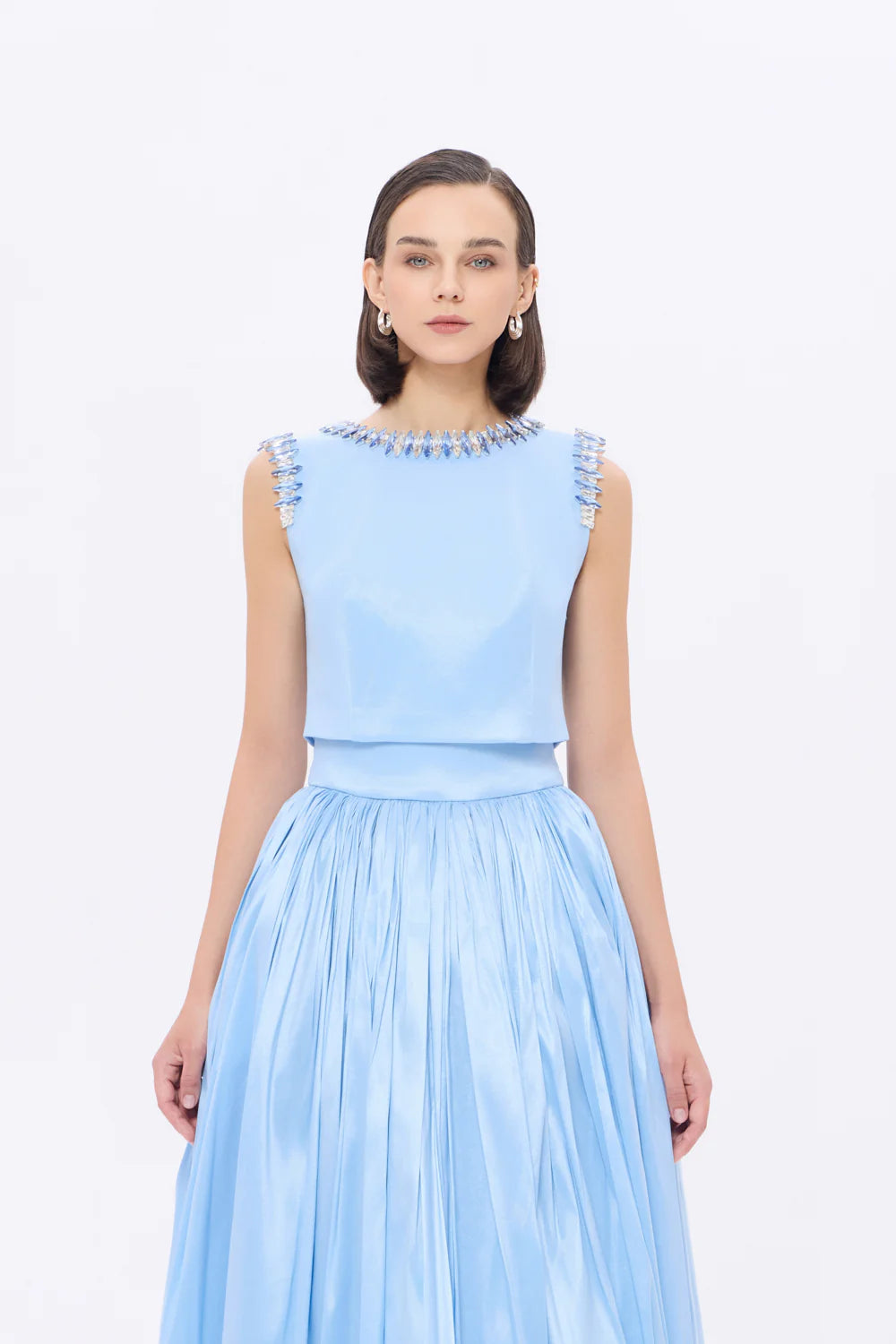 TAŞ İŞLEME DETAYLI TAFTA UZUN ABİYE ELBİSE - 9131C