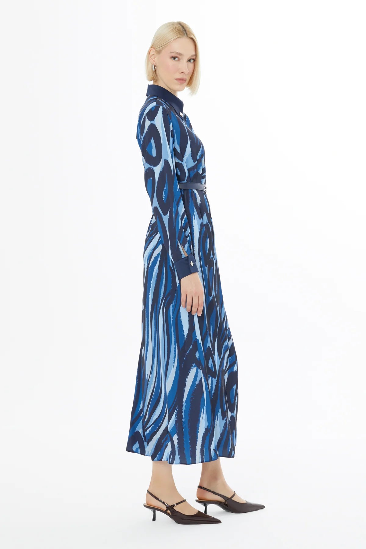 Uzun Kollu Gömlek Yaka Kemerli Maxi Elbise