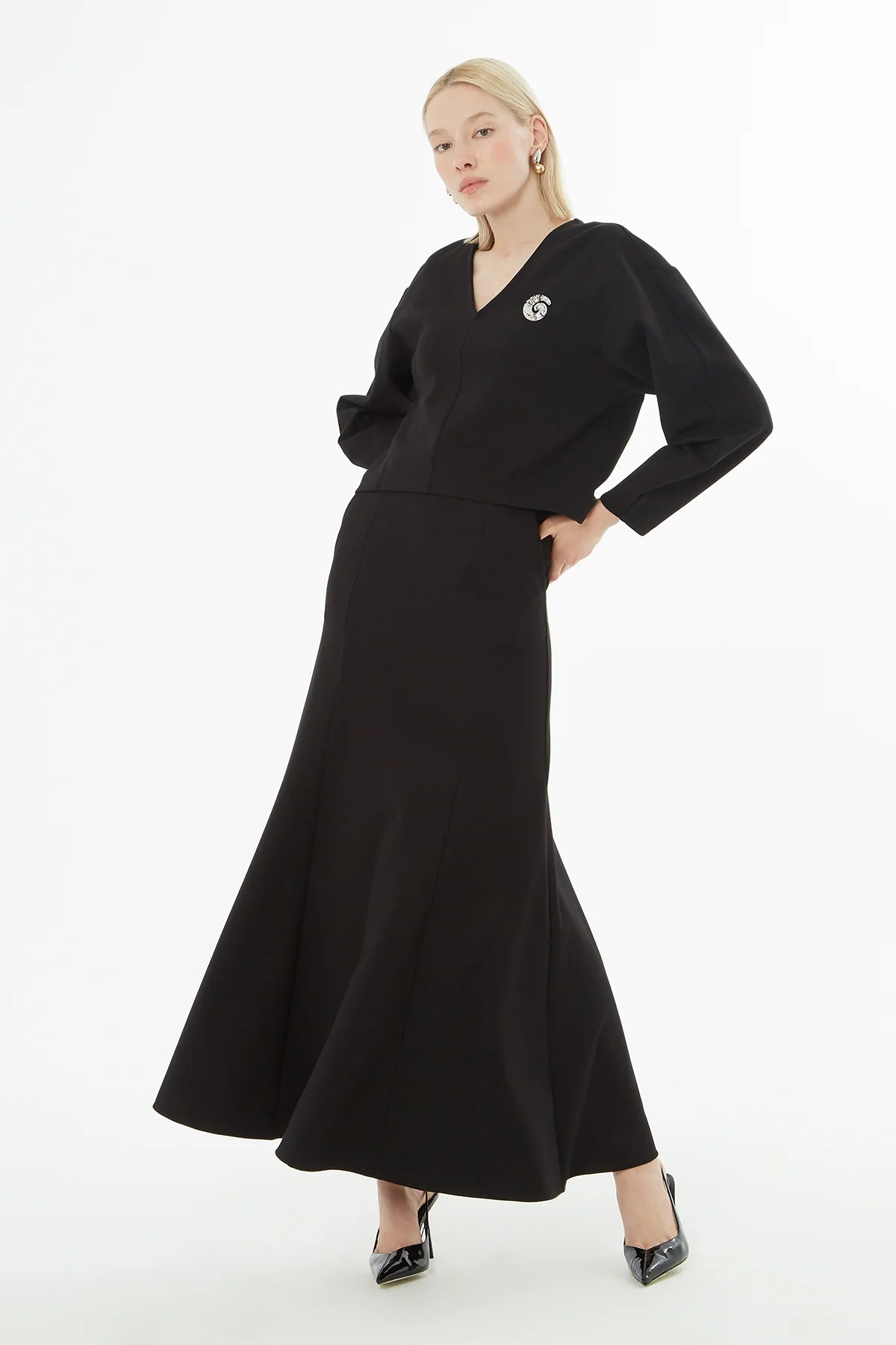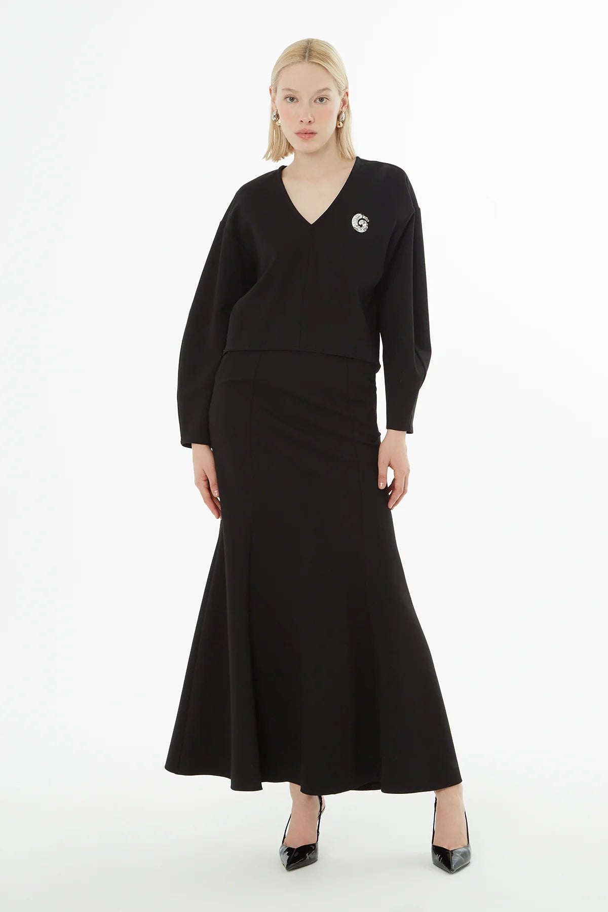 V Yaka Broşlu Bluz Volanlı Etekli Takım