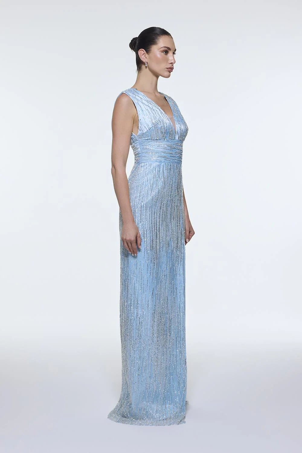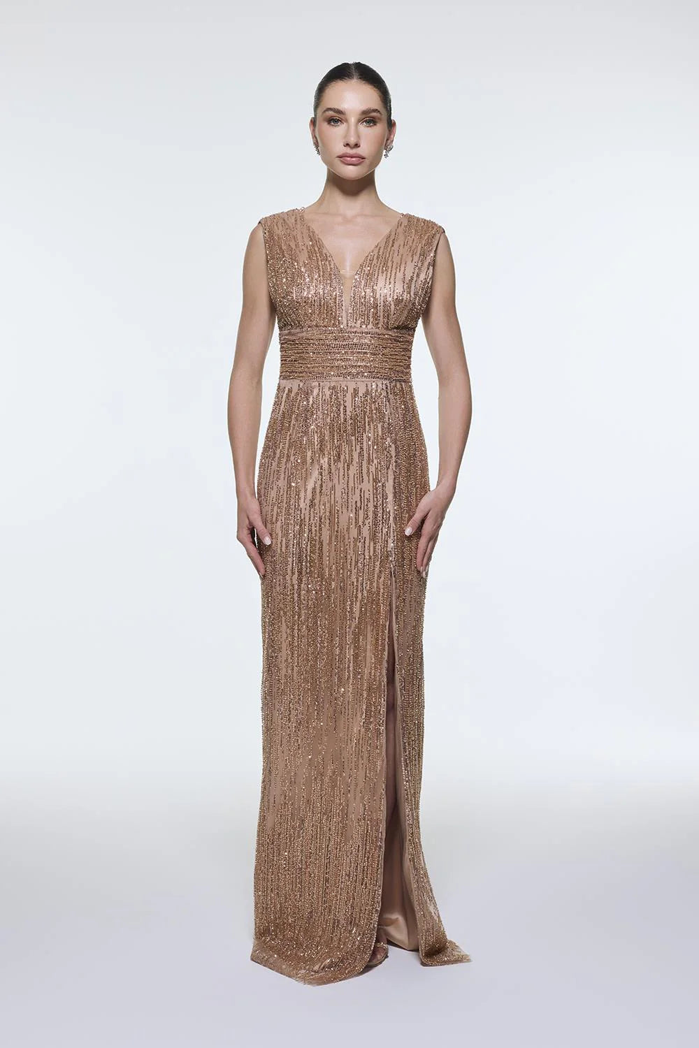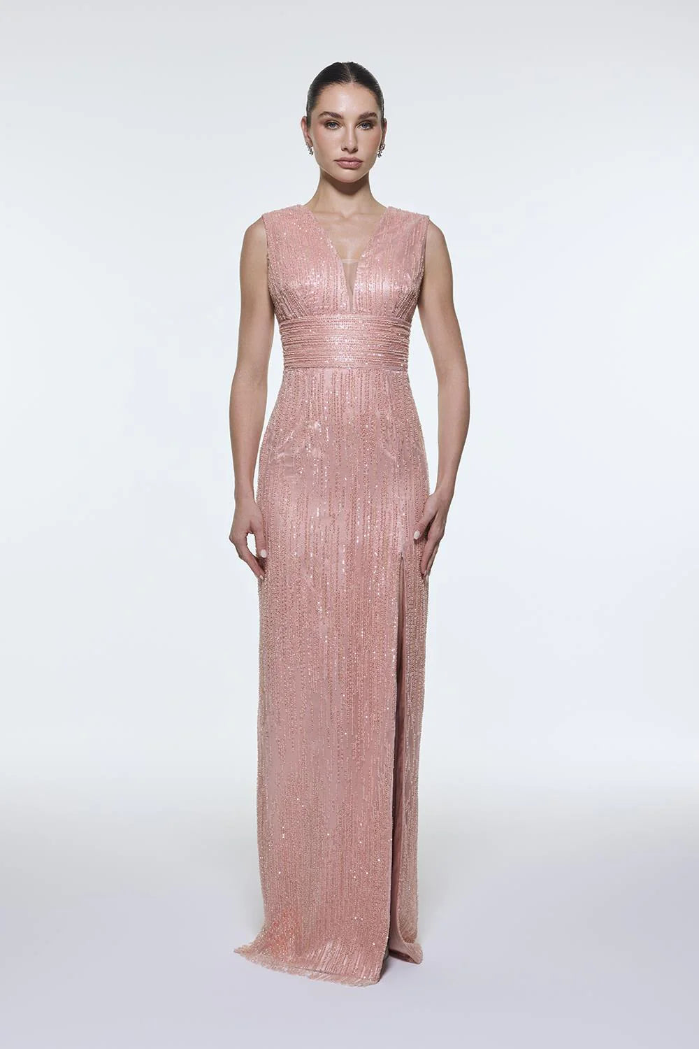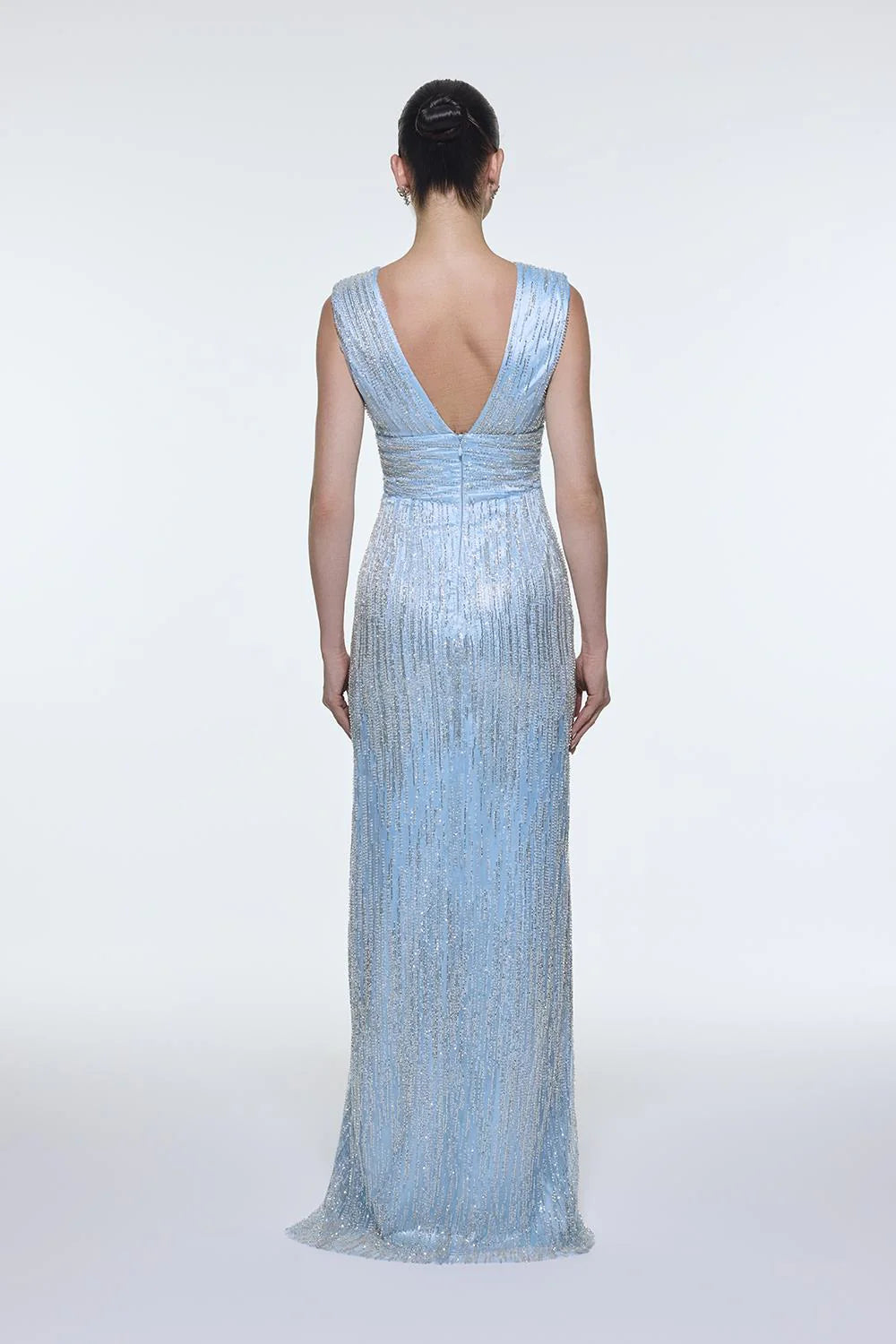 V YAKALI KOLSUZ TAŞ İŞLEMELİ ABİYE ELBİSE - 9349C