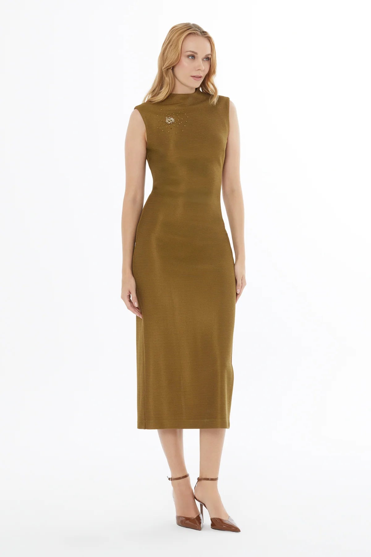Yuvarlak Yaka Fermuar Kapamalı Yırtmaçlı Sıfır Kol Midi Elbise
