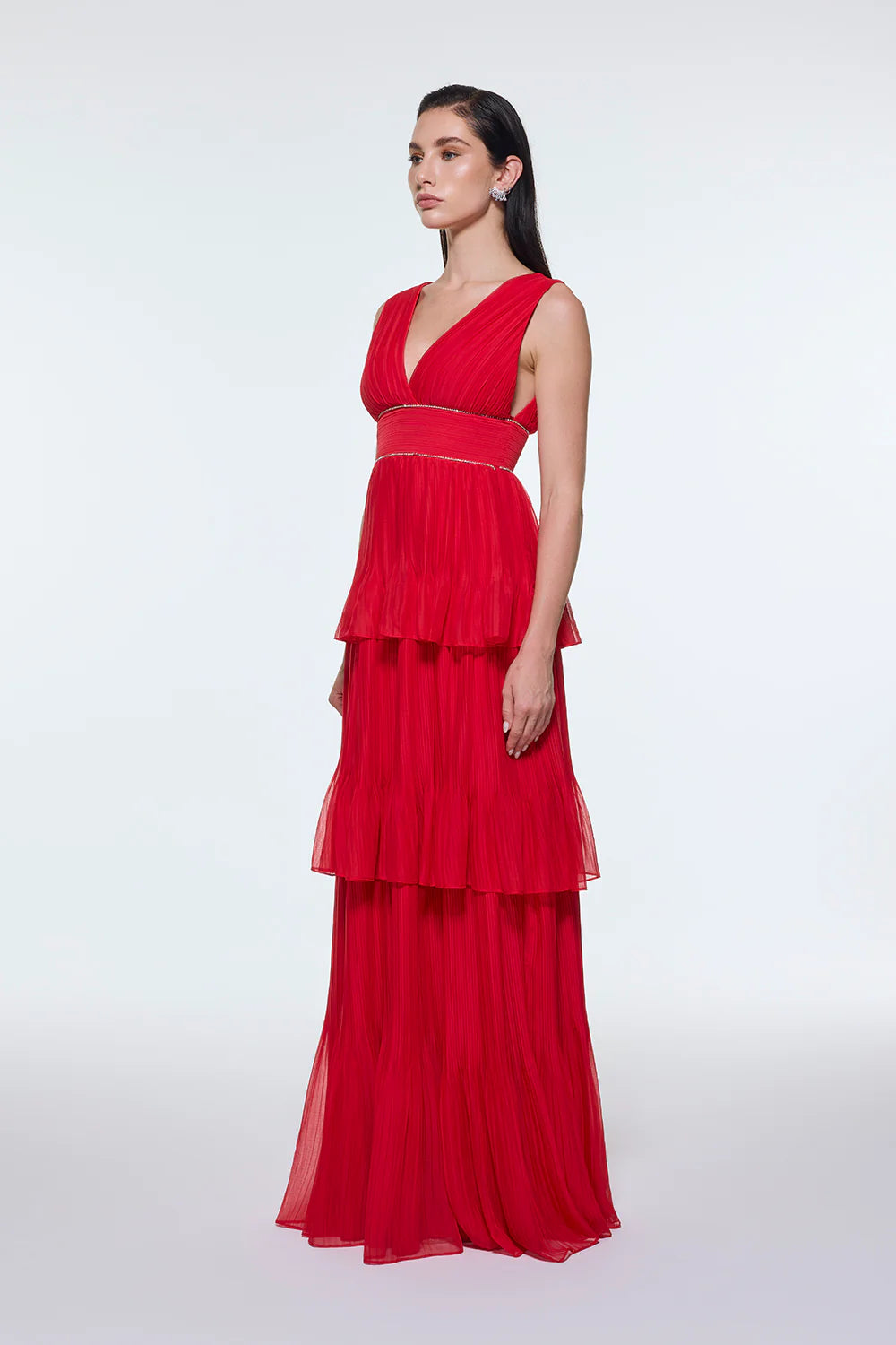 V YAKA VOLANLI ŞİFON UZUN ABİYE ELBİSE - 9274C
